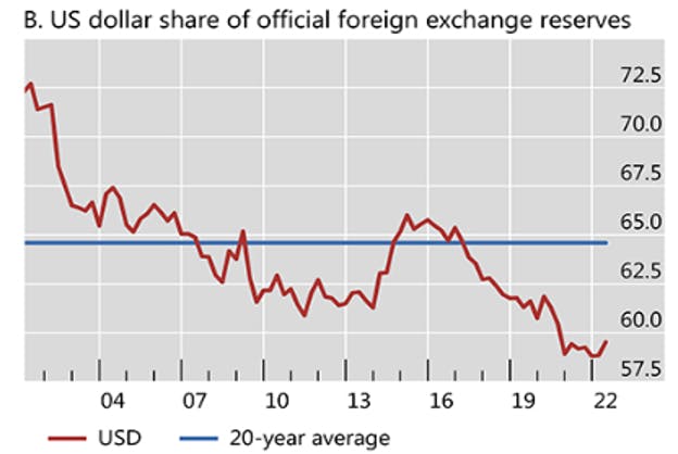 With this loose definition in mind, it’s important to look at data over the last few decades, for more context. The USD’s share of foreign exchange reserves has been steadily declining for the better part of the last 2 decades (>70% in 2000 vs. 60% in 2022), with little effect on the dollar’s relative strength: