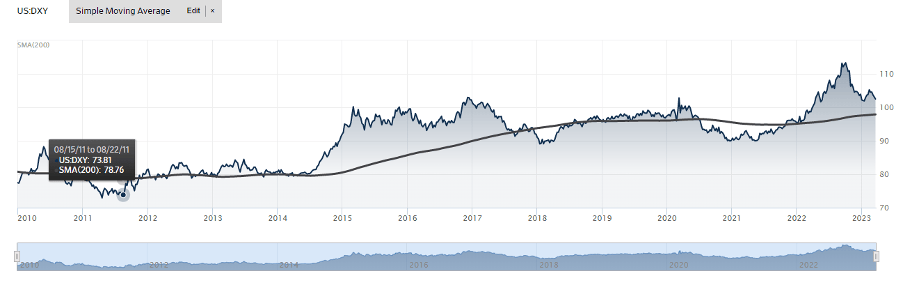 The U.S. Dollar Index (DXY), which ranks the dollar against a basket of 6 currencies, has maintained relative stability over this same period and has even been in an uptrend since 2010, with periodic moments of relative weakness: