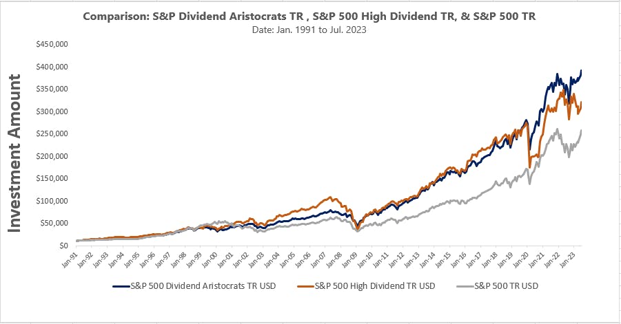 While some investors may choose to focus on companies that consistently grow their dividends over time, others may focus on companies that offer the highest level of dividend payout. The S&P 500 High Dividend Index reflects this ideology, as it provides exposure to the highest quintile of dividend-paying stocks in the S&P 500. While the absolute performance of focusing on high dividend equities is strong, the investment experience it provides over a long-time frame is very different, as observed from the chart.