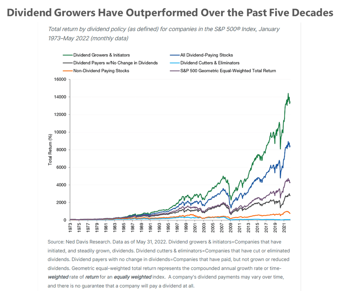 As observed from the following chart, shares of companies that have initiated, and steadily grown dividends have outperformed companies with different dividend policies, including paying but not growing their dividend, cutting, or eliminating the dividend, or not paying a dividend at all. This long-term outperformance is attributable to the typical profile of a dividend grower: a stable business model, a strong balance sheet, a history of capital discipline, and management teams committed to returning value to shareholders. Companies exhibiting both the willingness and ability to persistently grow their dividends have delivered value over a variety of market and economic cycles and through difficult operating environments.
