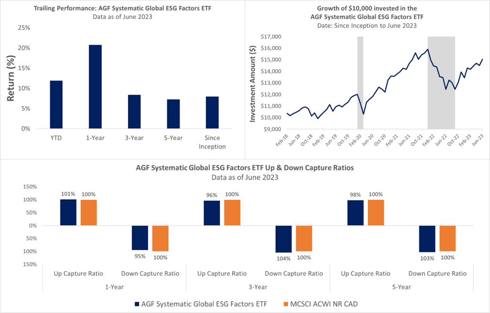 While the topic of ESG may elicit polarizing opinions among people these days, there is sufficient academic and empirical proof to support the notion that integrating environmental, social, and governance considerations into the portfolio investment process can lead to better performance. The AGF Systematic Global ESG Factors ETF is reflective of this belief, as the solution integrates ESG data in a quantitative multi-factor model to evaluate equity securities of global issuers.