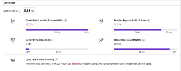 Finally, the fund’s Governance rating of 5.88 is indicative of matters pertaining to corporate governance and corporate behavior. On the matter of female board member representation, the fund ranks high, with approximately 75% of the solution’s market value being exposed to companies where at least 30% of the board of directors are women. Additionally, independent board majority and no link between executive pay and company performance are areas ranked highly.