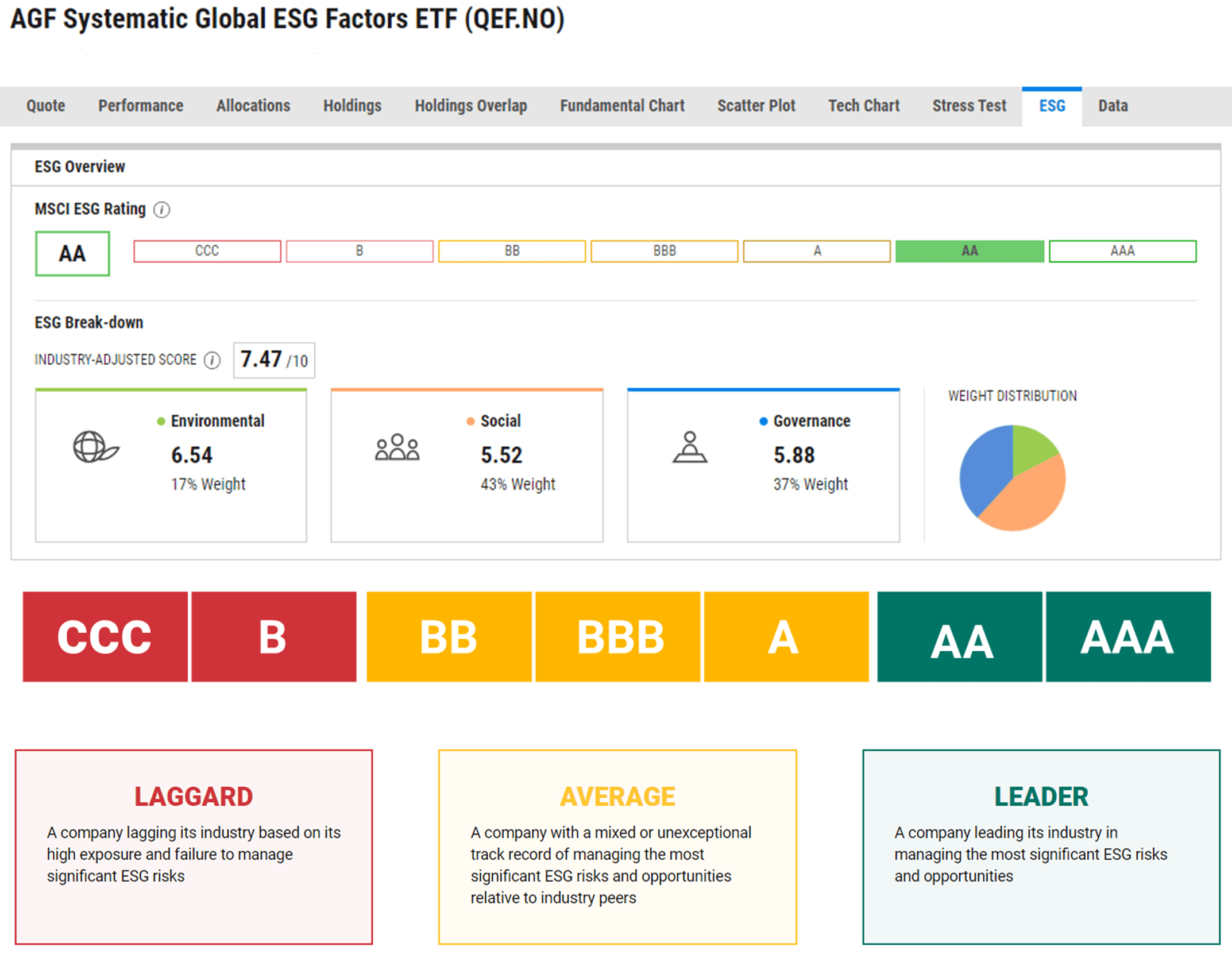 ESG data sourced from MSCI rates the AGF Systematic Global ESG Factors ETF highly, with a leadership classification.