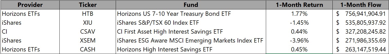 The iShares S&P/TSX 60 Index (Ticker: XIU) and iShares ESG Aware MSCI Emerging Markets Index ETF (Ticker: XSEM) received the second and fourth most flows, respectively, for the month. Despite the equity markets being down broadly for the month, flows into these equity solutions were strong. Having broad exposure to equity markets has proven to be beneficial thus far in 2023, as the year-to-date performance of these mandates has been in positive territory.