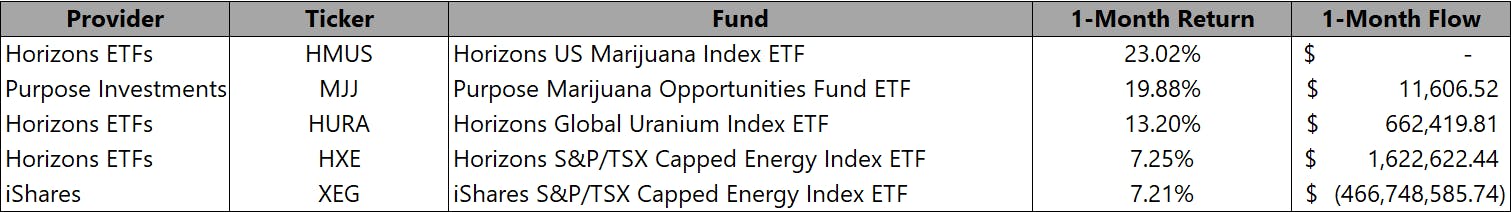 The Horizons S&P/TSX Capped Energy Index ETF (Ticker: HXE) and iShares S&P/TSX Capped Energy Index ETF (Ticker: XEG) had the fourth and fifth best performance, respectively, for the month. Crude oil prices continue to remain elevated, primarily because of extended voluntary cuts to Saudi Arabia’s crude oil production and increasing global demand. As a result, these factors will continue to reduce global oil inventories and put upward pressure on oil prices in the coming months. Both ETFs reflect these macroeconomic changes occurring within the energy sector for the month.
