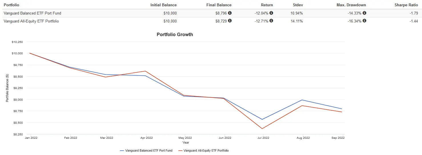 Fast-forward to 2022, where a rare combination of high inflation and rapidly rising interest rates caused even short-duration bonds to tank in unison with stocks. Case in point, the 60/40 stocks/bonds Vanguard Balanced ETF Portfolio (VBAL) has suffered as much as the 100% stocks Vanguard All-Equity ETF Portfolio (VEQT) since the start of 2022.