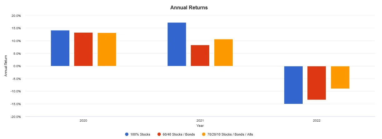 NALT has performed well since inception, returning 10.43% in 2020, 6.51% in 2021, and 12.05% in 2022. However, this information is useless in isolation, as we need to assess how NALT contributes to a diversified portfolio. Below, I've plotted a backtest of three portfolios from 2019 (when NALT debuted) to the present: