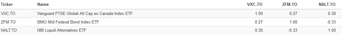 - 60/40 in stocks and bonds via VXC and the BMO Mid Federal Bond Index ETF (ZFM).