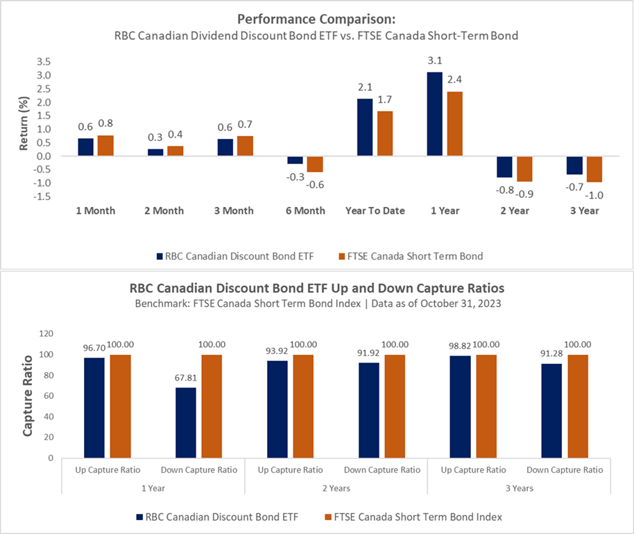 The RBC Canadian Discount Bond ETF provides investors with exposure to the performance of a diversified portfolio of primarily Canadian government and corporate bonds which at the time of purchase are trading below the weighted average price of the universe of Canadian short-term bonds to provide regular income while preserving capital.