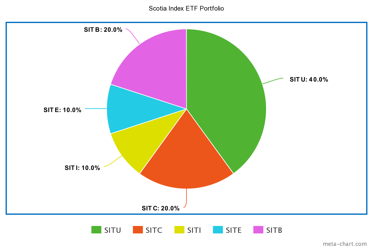 For my portfolio, I'm eyeing a 10% allocation each to the Scotia Emerging Markets Equity Index Tracker ETF (SITE)and the Scotia International Equity Index Tracker ETF (SITI). Their respective expense ratios are 0.34% and 0.22%.