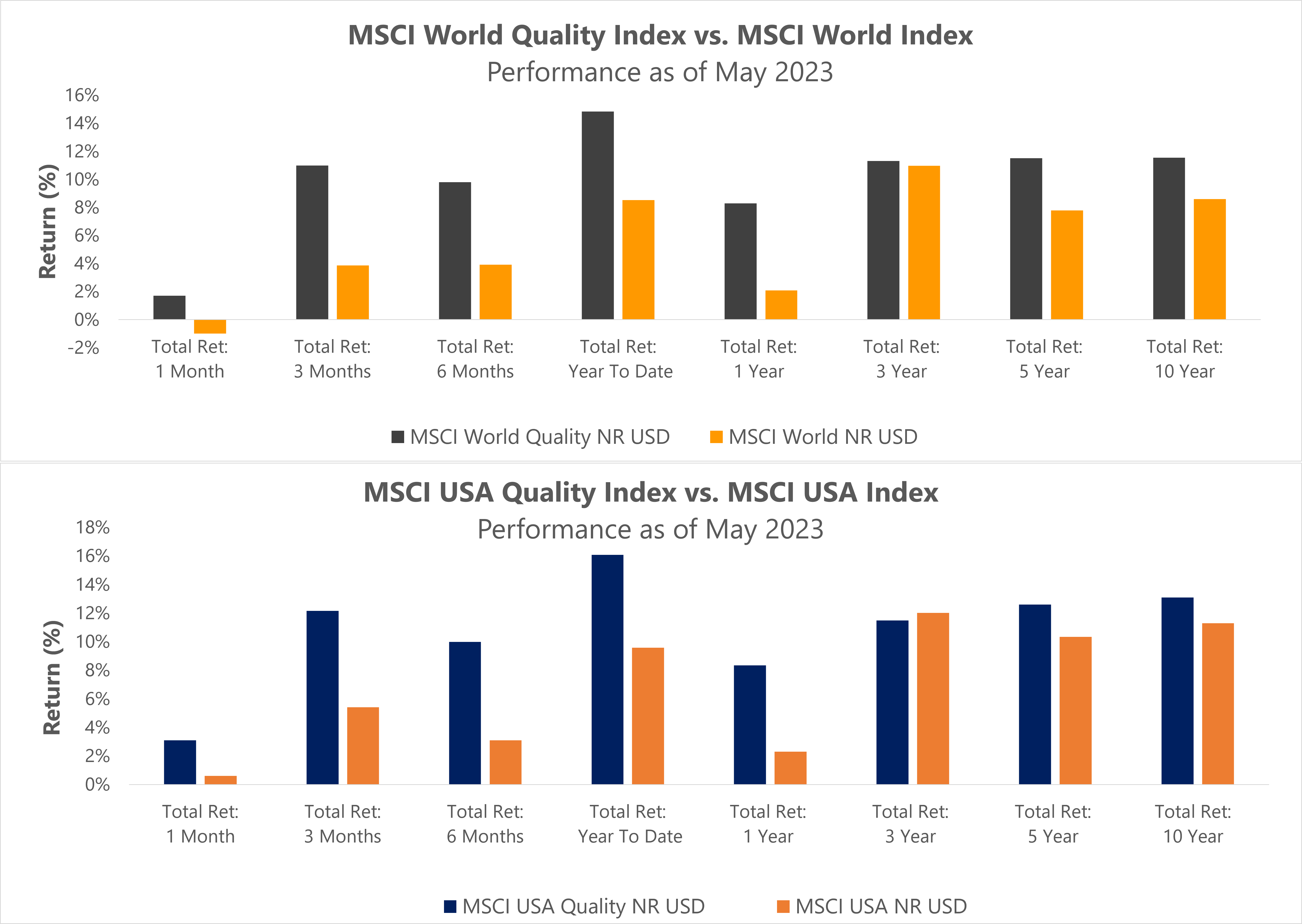 L'investissement axé sur les facteurs de qualité est une stratégie d'investissement qui se concentre sur l'identification et la sélection d'entreprises de haute qualité à des fins d'investissement. Elle vise à trouver des entreprises dont les fondamentaux sont solides, les bénéfices stables et la santé financière robuste. Le facteur qualité repose sur l'idée que les entreprises de qualité ont tendance à surperformer leurs pairs sur le long terme et à faire preuve de résilience pendant les périodes de ralentissement du marché. L'examen des données révèle le bien-fondé de cette idéologie. Les graphiques suivants comparent les performances de l'indice MSCI World Quality et de l'indice MSCI Quality USA par rapport à leurs indices de référence respectifs, à partir de mai 2023.