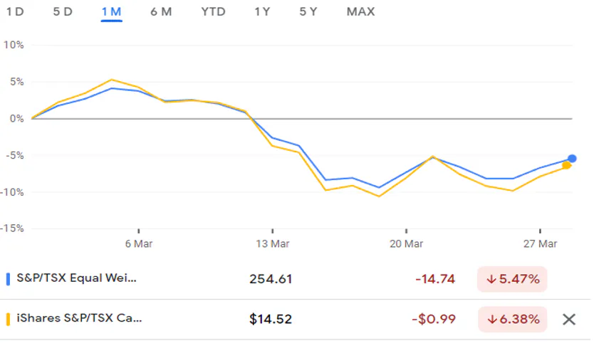 En conséquence, l'indice S&P/TSX Equal Weight Oil and Gas (TXOE) a chuté de 13 % entre le 6 et le 16 mars, tandis que l'indice iShares S&P/TSX Capped Energy (XEG) a chuté de près de 16 % au cours de la même période. Les deux indices ont depuis commencé à se redresser et ne sont en baisse que de 5,5 % et 6,5 % respectivement pour le mois.