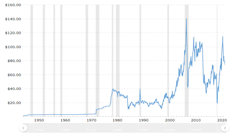 Comme il s'agit d'un produit de base économiquement sensible, les attentes de récession ont tendance à être corrélées à une baisse des prix du pétrole dans l'esprit des investisseurs, et certaines données viennent étayer ce point de vue. Sur les 80 dernières années, le prix du pétrole a connu des baisses modérées au cours des périodes ombrées, qui représentent les récessions.