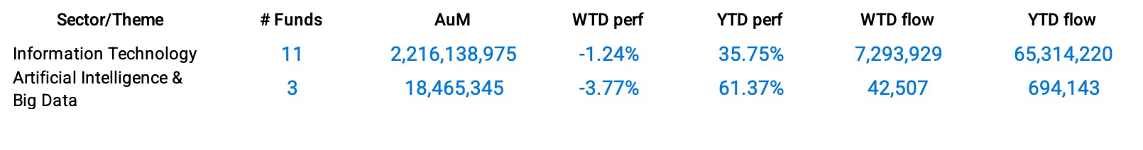 Le secteur informatique de l'indice S&P a perdu 2,87 % sur la semaine. Les ETF des semi-conducteurs et de l'intelligence artificielle ont été les plus touchés avec des pertes comprises entre -4% et -6%.
