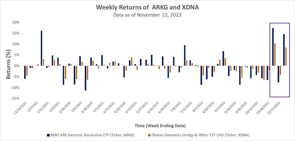 En examinant les récentes données sur le rendement hebdomadaire du FNB BMO ARK Genomic Revolution (symbole : ARKG) et du FNB iShares Genomics Immunology And Healthcare Index (symbole : XDNA), deux importantes solutions axées sur la génomique, on constate que leur rendement au mois de novembre 2023 a jusqu'à présent été supérieur à leurs récentes moyennes historiques.