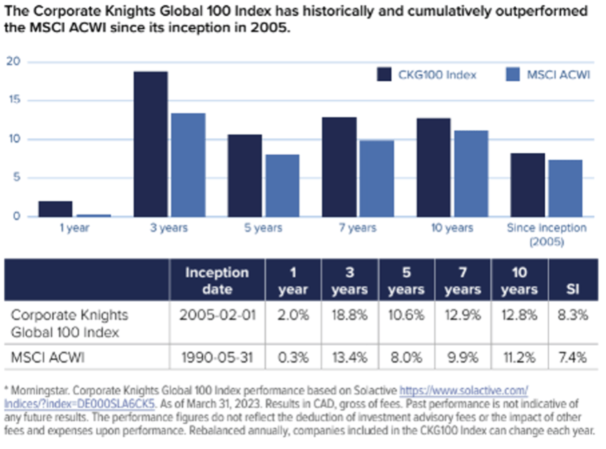 Historiquement, cette crainte ne s'est pas concrétisée dans la performance de l'indice Corporate Knights Global 100. Comparé à l'indice MSCI All Country World, l'indice CKG 100 a cumulé des performances supérieures à celles de l'indice MSCI All Country World depuis sa création en 2005. Cet historique impressionnant souligne la conviction de Corporate Knights que les entreprises durables peuvent également produire des rendements solides.